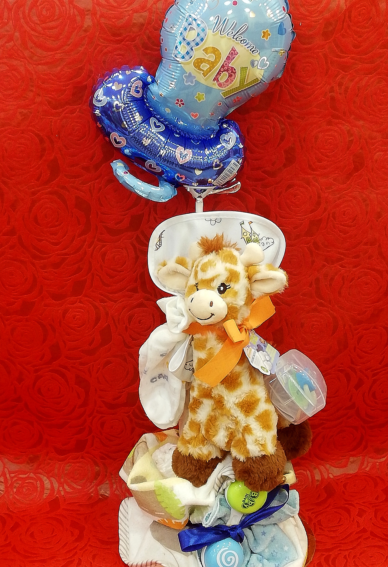 Περιέχει: Λούτρινο κουκλάκι διάφορα σχέδια, μπαλόνι πολύχρωμο διάφορα σχέδια, πιπίλα, καλτσάκια ή παιχνιδάκι, πάμπερς, βαμβακερά πανάκια, πετσετούλες, σαλιάρα